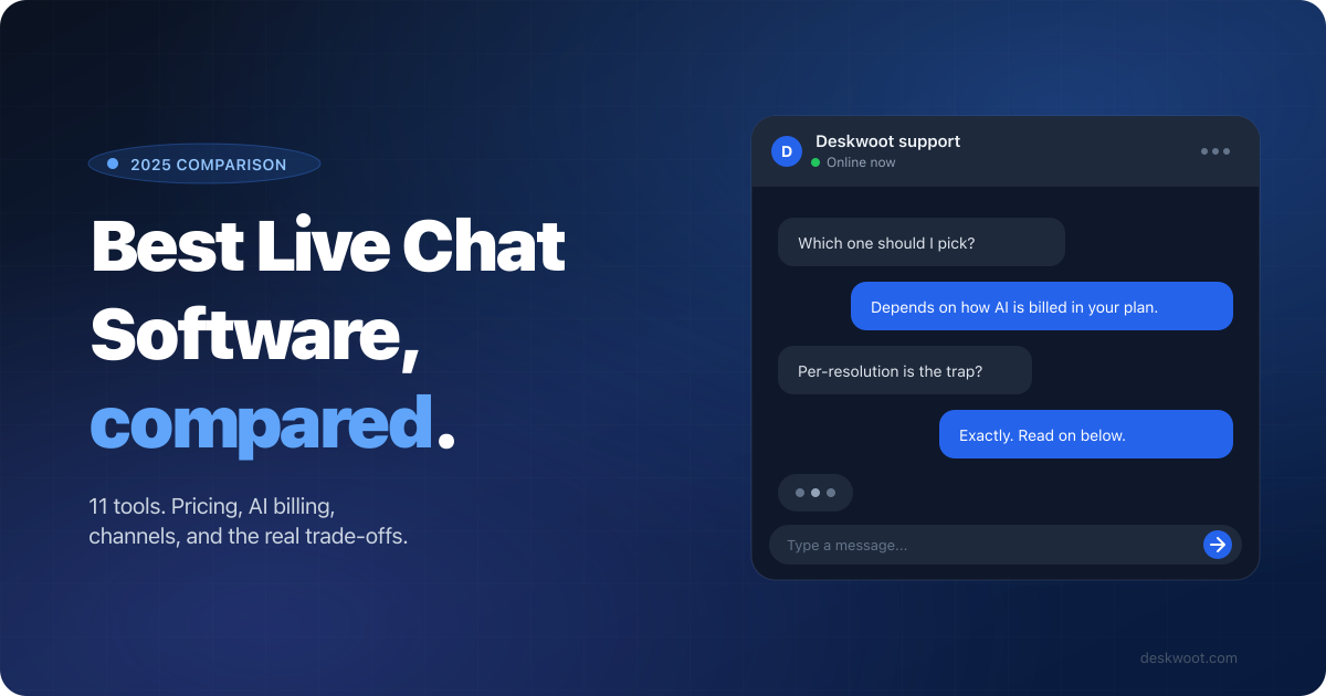 An honest side-by-side comparison of 11 live chat tools: pricing, AI billing, channels, and who each one is actually a good fit for. We built Deskwoot, so we benchmark against everyone on this list.
